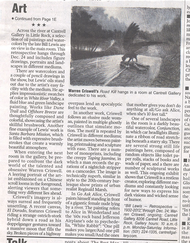 "Bill Lewis - Retrospective - 1932-2012," through Dec. 24; Warren Criswell, ongoing; Cantrell Gallery, 8206 Cantrell Road, Little Rock. Gallery hours: 10 a.m.-5 p.m. Monday-Saturday. Information: (501) 224-1335, cantrellgallery.com. |