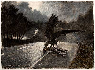 ![]() Warren Criswell's monotype "Roadkill" hangs in a room at Cantrell Gallery dedicated to his work |