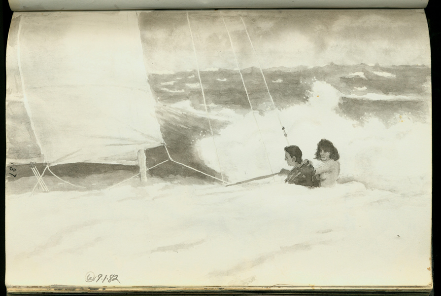 Page 187a. 9/1/82, Happy Mentos to you (Sailing in the natural state) A slightly altered drawing of a commercial. I grew up sailing small boats in southeast Florida, having become obsessed with sailing after reading Children of the Sea by Wilfrid Bronson when I was 11, in 1947. My father was back from the War, and I talked him into helping me build a boat. We built a 9 foot pram in the garage of our home on North Flagler Dr. in West Palm Beach,, across the street from the Flotilla yacht Club. I fitted it out with leeboards and a lateen-rigged sail. We hauled it across the street and down to Lake Worth, the Intracoastal waterway, and I sailed that sucker up and down the lake, to Peanut Island and back, using a steering oar like the boy in the Bahamas, not a rudder. I learned to sail from books I checked out from the Northboro School library. They say you can't learn to sail from books, but I did. Later, all through my teens, I sailed more conventional crafts, including a sloop-rigged catamaran that I sailed out the Palm Beach inlet into the Atlantic. Never quite made it to Nassau. But now here I am, since 1979, landlocked in The Natural State. Hence the altered drawing. |