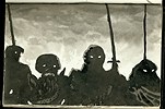 Another curious thing ... What I didn't know in 1982 (or rather had forgotten reading in The Holy Sword by Robert Payne), and which Tolkien may or may not have known, is that there were Islamic "Black Riders" in 8th Century Persia (Iran). They were the followers of the rebel leader Abu Muslim, who put a bloody end to the corrupt empire of the Umayyads in 747. "They flew the black banners of the Abbasids and wore black clothes, and saluted the banners known as 'the Cloud' and 'the Shadow.' The symbolism was deliberate: like clouds and shadows the armies of the Abbasids would pour out of Persia onto the plains of Iraq, and so to the coasts of Syria." (Payne, 1965, p. 165) All of which was repeated by ISIS - in slightly different order - in 2014. However, when I drew the Black Riders (from the first movie version of Lord of the Rings shown on TV) I didn't think of them as specifically representing either Palestinians or Israelis, neither Muslims, Jews nor Christians, but only the Spirit of War, which embraces all of these "Sons of the Book" with equal passion. |